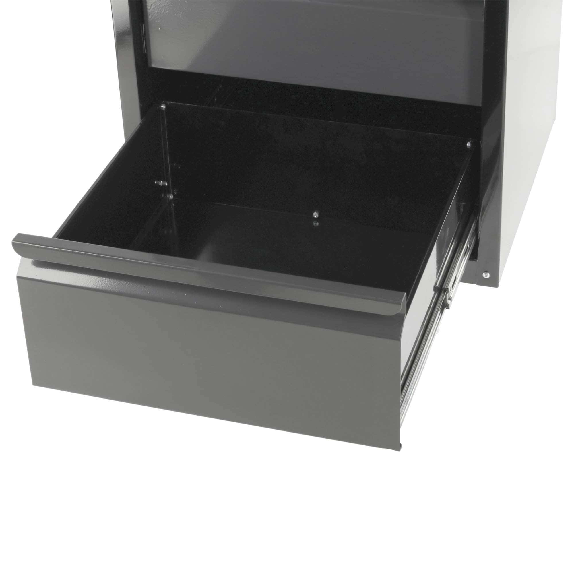 Kestävä työkalukaappi työpajan, autotallin tai huoltotilan järjestyksen ylläpitämiseen. Kaappi on valmistettu pulverimaalatusta teräslevystä, tyylikäs musta pintakäsittely sopii hyvin erilaisiin työympäristöihin.